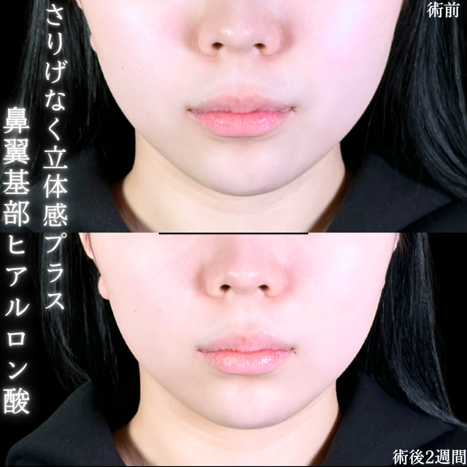 鼻の付け根のへこみを自然に補正し、ほうれい線の目立ちにくい立体感のある横顔へ。