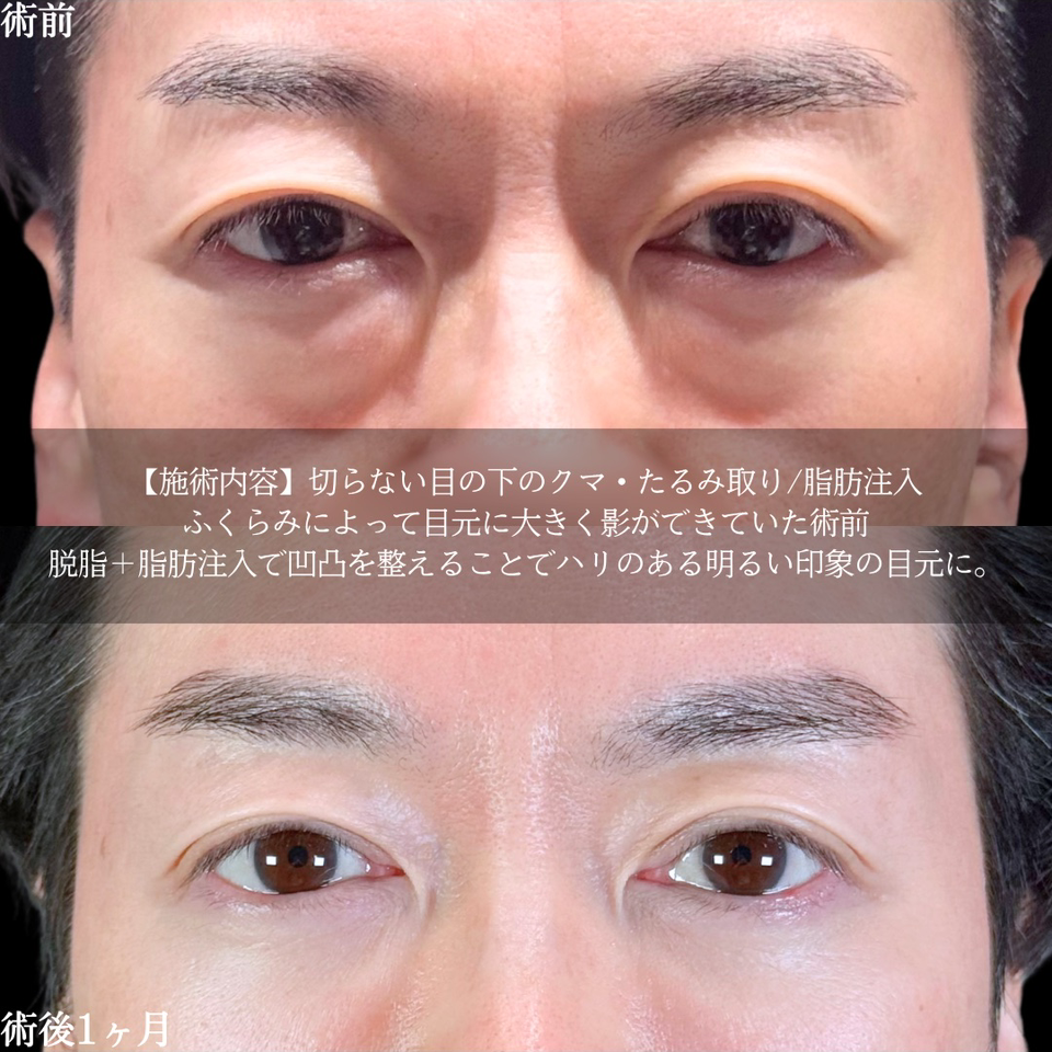 | 施術リスク | 【目の下のたるみ取りの施術リスク】腫れ・内出血・膨らみが残る・まぶたが凹みすぎたと感じる・膨らみや凹み具合など、仕上がりに左右差があると感じる・目がゴロゴロする・若返り効果が物足りない・小ジワ・シワ・たるみが残る、または増加する・目尻がつっぱるなどを生じることがあります。 【目の下の脂肪注入の施術リスク】腫れ・内出血・吸引部の皮膚が硬くなる、凹凸になる・施術箇所の知覚の麻痺・鈍さ、しびれ・色素沈着などを生じることがあります。 |