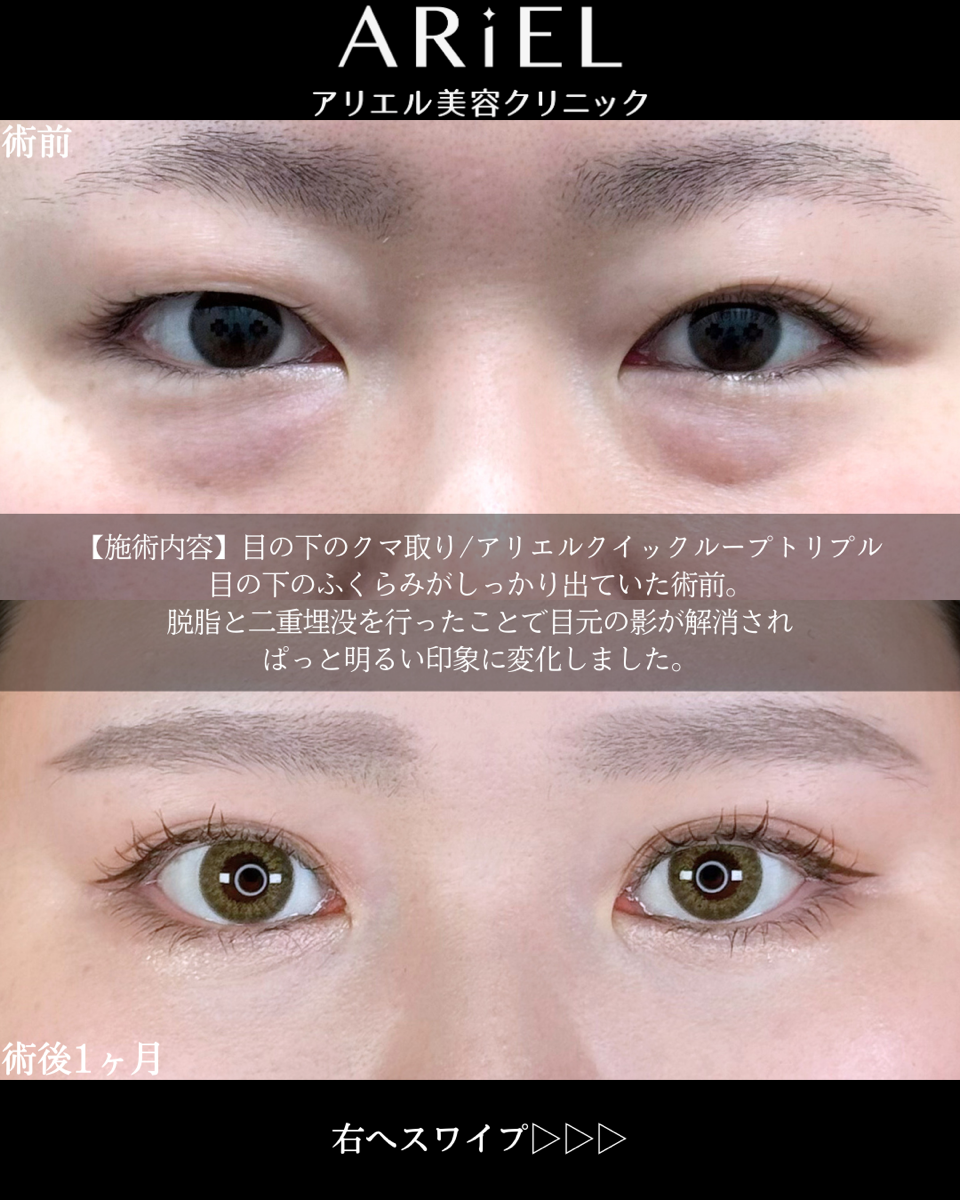 施術リスク | 【二重埋没法の施術リスク】腫れ・内出血・目がゴロゴロする、左右差があると感じる、違和感を感じるなどを生じることがあります。 【目の下のたるみ取りの施術リスク】腫れ・内出血・膨らみが残る・まぶたが凹みすぎたと感じる・膨らみや凹み具合など、仕上がりに左右差があると感じる・目がゴロゴロする・若返り効果が物足りない・小ジワ・シワ・たるみが残る、または増加する・目尻がつっぱるなどを生じることがあります。 |