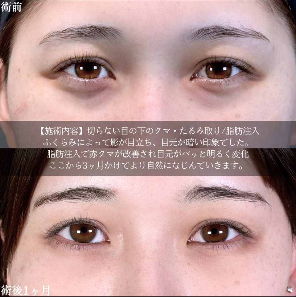 | 施術リスク | 【目の下の脂肪注入の施術リスク】腫れ・内出血・吸引部の皮膚が硬くなる、凹凸になる・施術箇所の知覚の麻痺・鈍さ、しびれ・色素沈着などを生じることがあります。 |